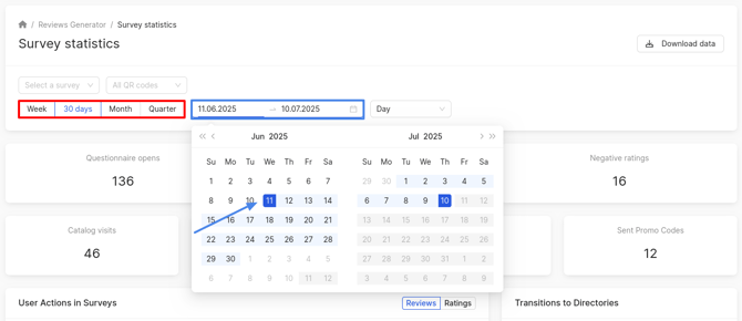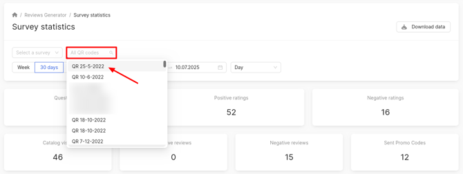 Now, the statistics are being collected again: when selecting a specific survey or QR code in the filter, the promo code information is displayed only for the selected item.