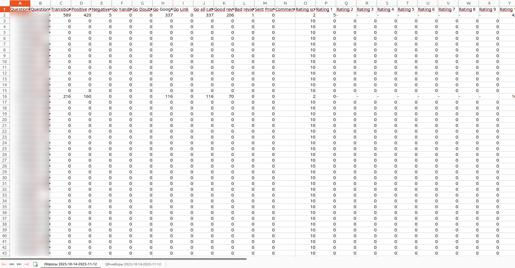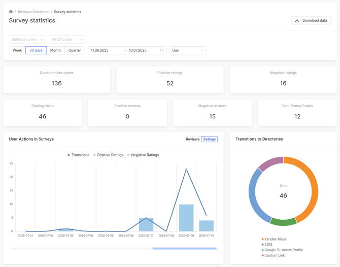 - Catalog visits - the number of clicks from the survey to main directories (Google, Yandex, 2GIS (URBI)) or via your link.