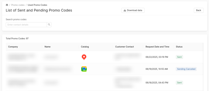 In this section, promo codes that have been sent to customers and/or are awaiting use are displayed.