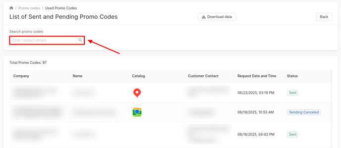 The list of promo codes can be filtered based on the clients' contact information.