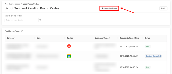 To export information about promo codes, click on Download data in the upper right corner of the section. The requested report will be sent to your email in .xlsx format, using the email address provided in your profile.