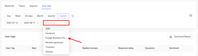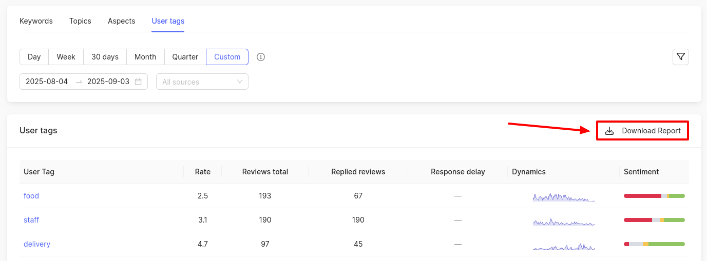 To export the statistics on custom tags in .pdf or .xlsx format, click on the Download Report button.